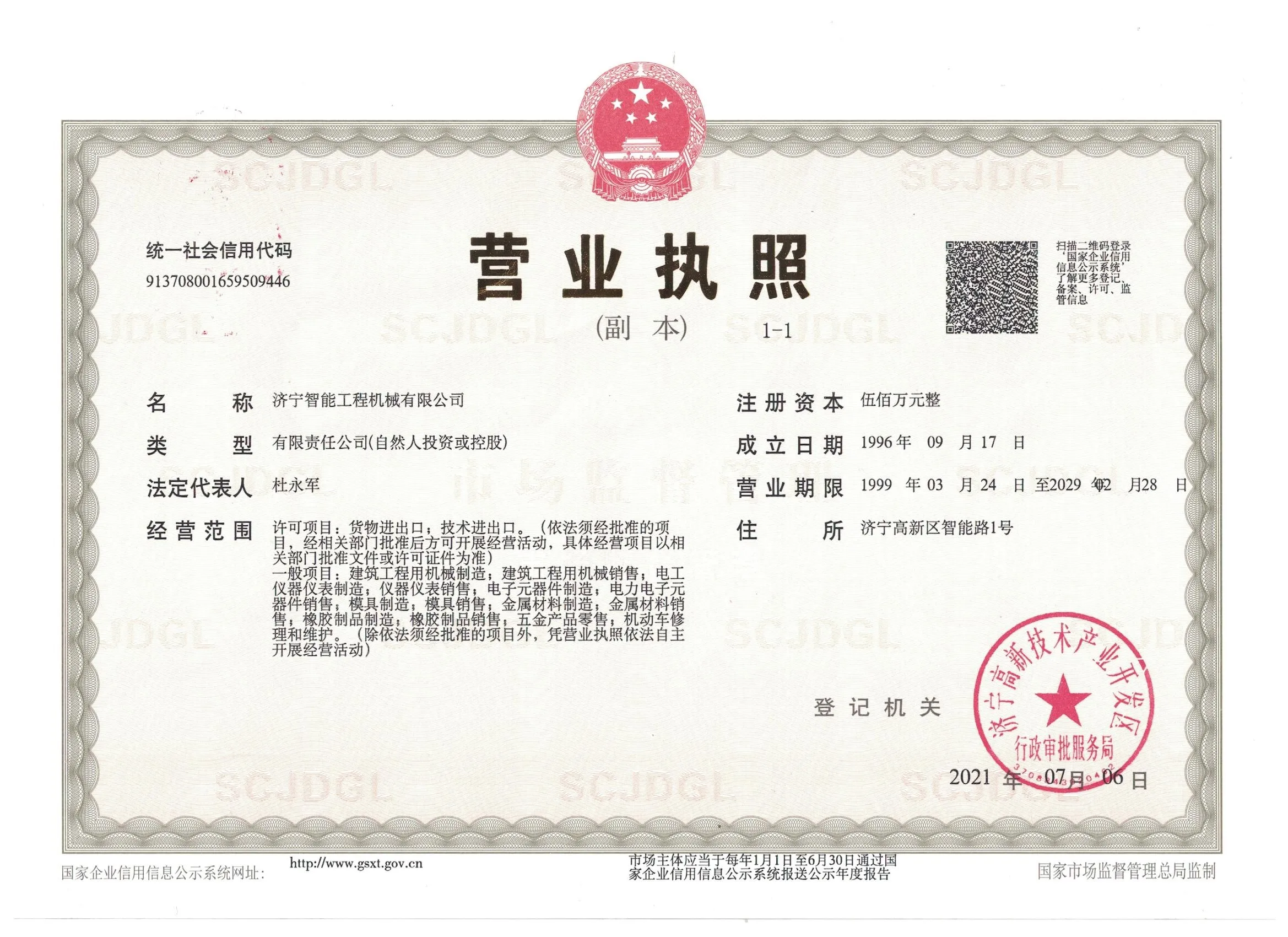 Registered address : No.1 Zhineng Road Jining Shandong China